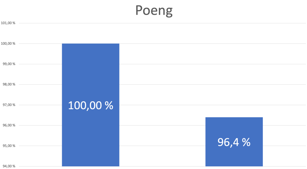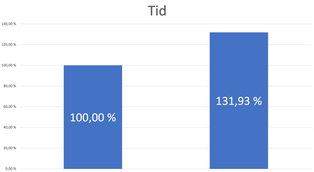 Når vi setter poeng opp mot tid, får vi et tydelig bilde: 100 % poeng delt på 131,9 % tid gir en hitfactor på rundt 76 %. Det plasserer oss i midtsjiktet både individuelt og som lag.